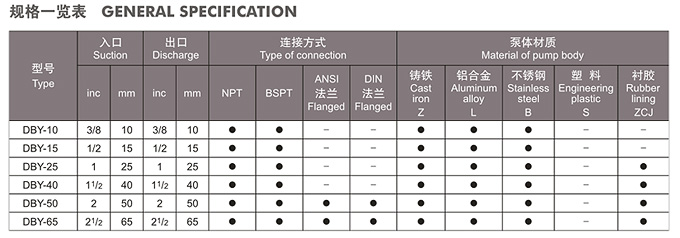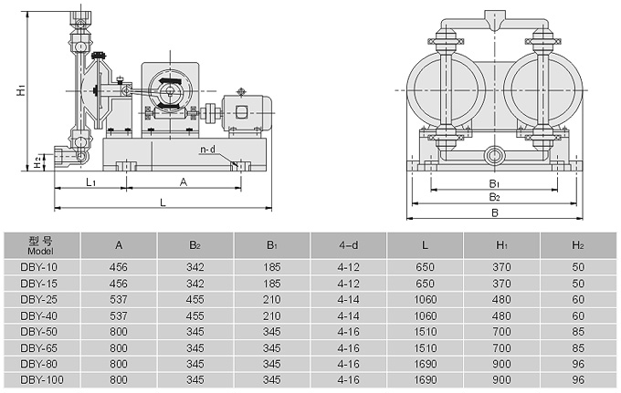 DBY型电动隔膜泵是一种新型的泵类,近年来,由于在隔膜材质上取得了突破性的进展,上越来越多的工业化采用此种型式的泵,取代部份离心泵、罗杆泵,来应用于石化、陶瓷、冶金等行业,我单位目前生产的电动隔膜泵产品设计均参考美国ABEL公司样机,DBY型隔膜泵适用于低压,即出口压力≤3kgf/cm2的场合。